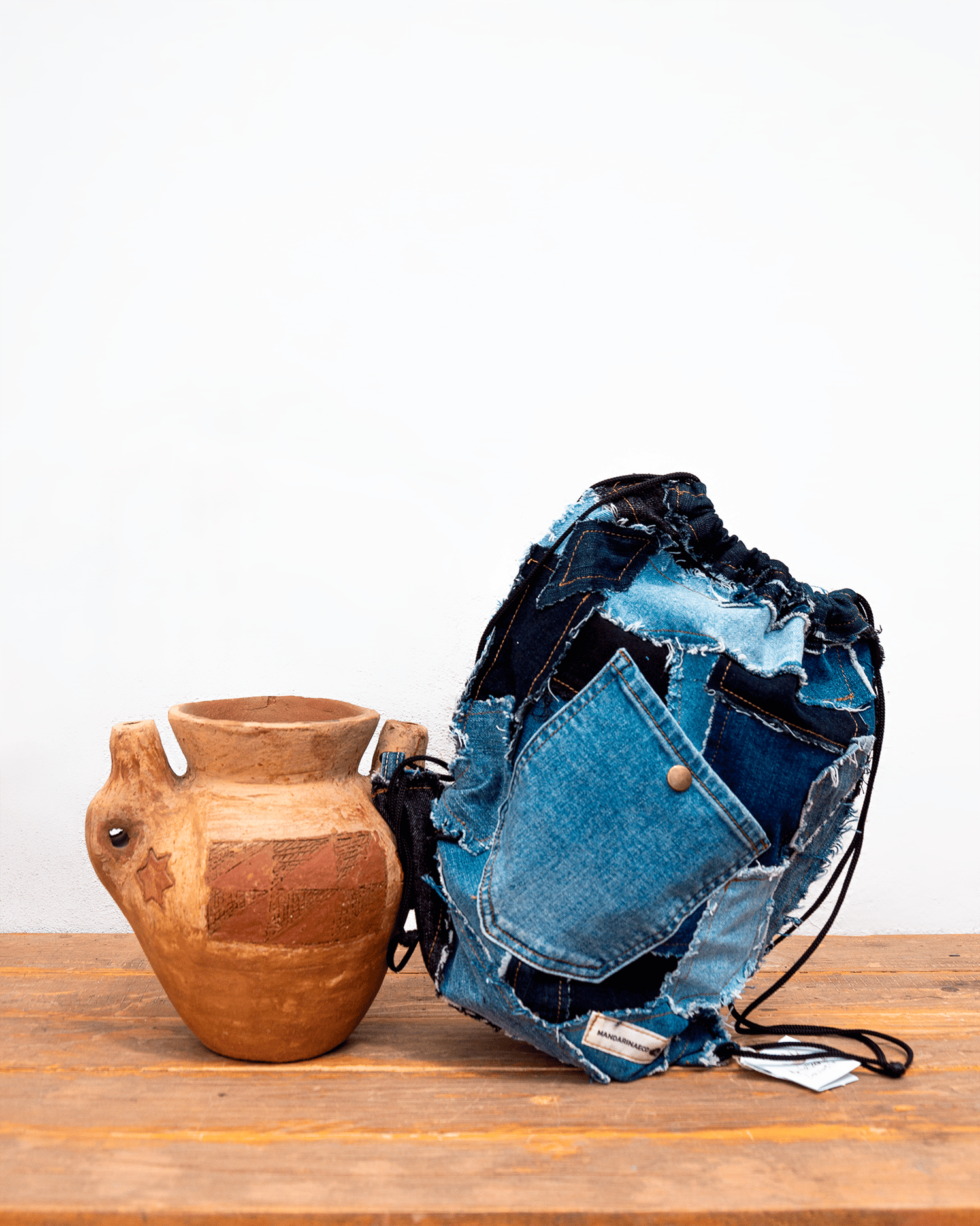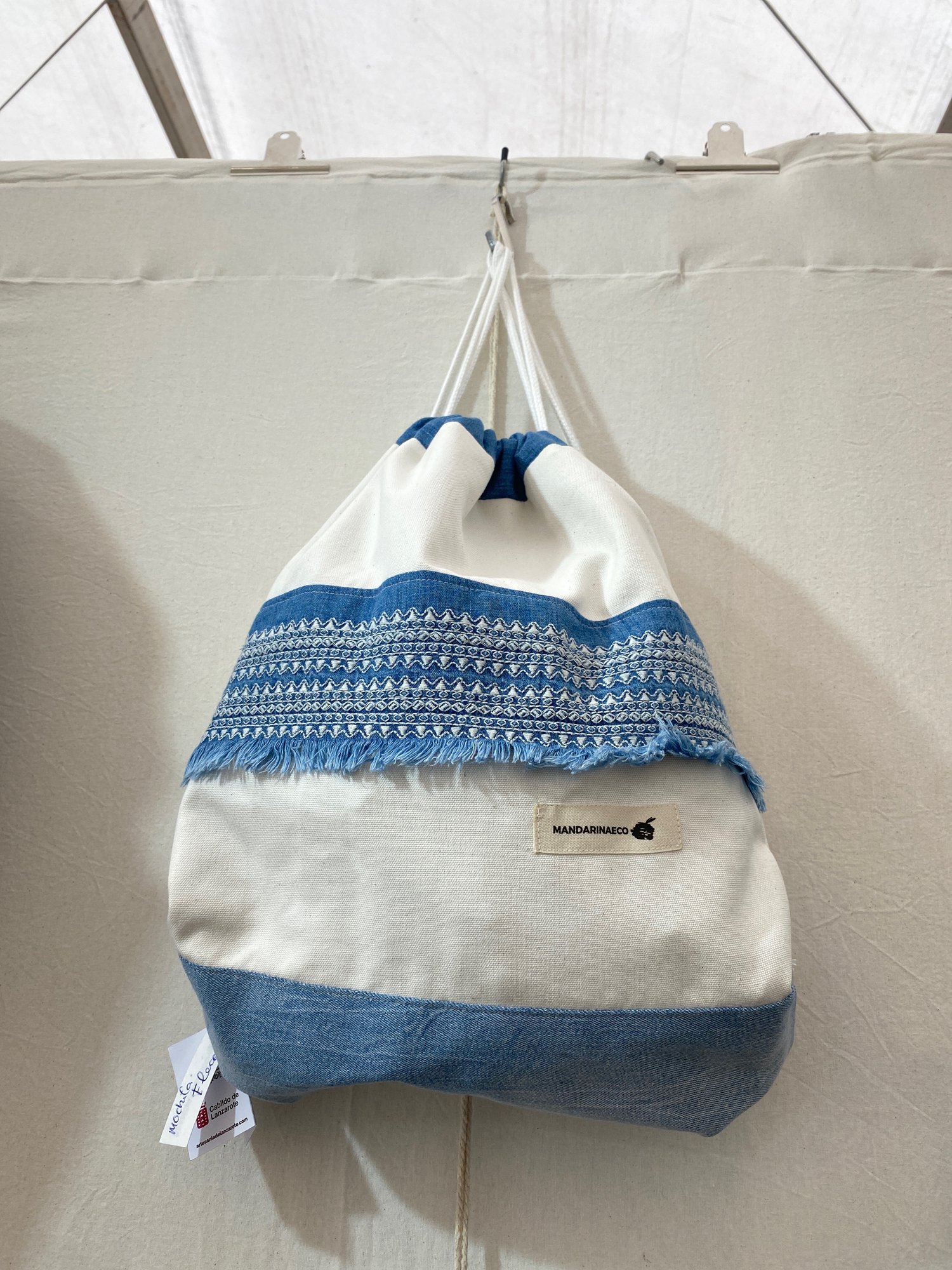 Mochila saco remiendos. 42 x 32 cm con bolsillos exterior e interior. Forrada y cierre cordón.